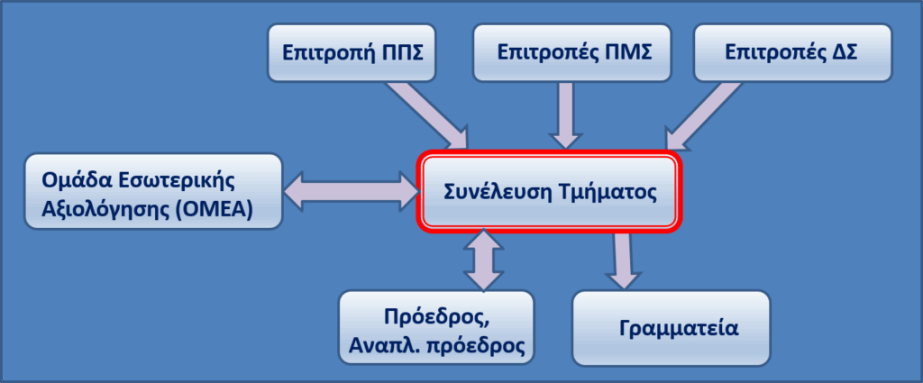 To Ανώτατο Όργανο Διοίκησης του Τμήματος είναι η Συνέλευση Τμήματος, η οποία είναι σε συνεχή αλληλεπίδραση με την Ομάδα Εσωτερικής Αξιολόγησης του Τμήματος. Η Συνέλευση αποφασίζει για όλες τις ενέργειες του Τμήματος, και στους τρεις κύκλους Σπουδών. Η Ομάδα Εσωτερικής Αξιολόγησης διασφαλίζει την ποιότητα των παρεχομένων εκπαιδευτικών υπηρεσιών σύμφωνα και με τις υποδείξεις της Μονάδας Διασφάλισης Ποιότητας του Ιδρύματος, εισηγούμενη τις απαραίτητες ενέργειες στη Συνέλευση. Υπεύθυνες για την εύρυθμη λειτουργία των τριών κύκλων σπουδών είναι η Επιτροπή Προπτυχιακού Προγράμματος Σπουδών, οι Συντονιστικές Επιτροπές των Προγραμμάτων Μεταπτυχιακών Σπουδών και των Διδακτορικών Σπουδών. Τις αποφάσεις της Συνέλευσης αναλαμβάνουν να υλοποιήσουν ο Πρόεδρος, ο Αναπληρωτής Πρόεδρος, και η Γραμματεία του Τμήματος.